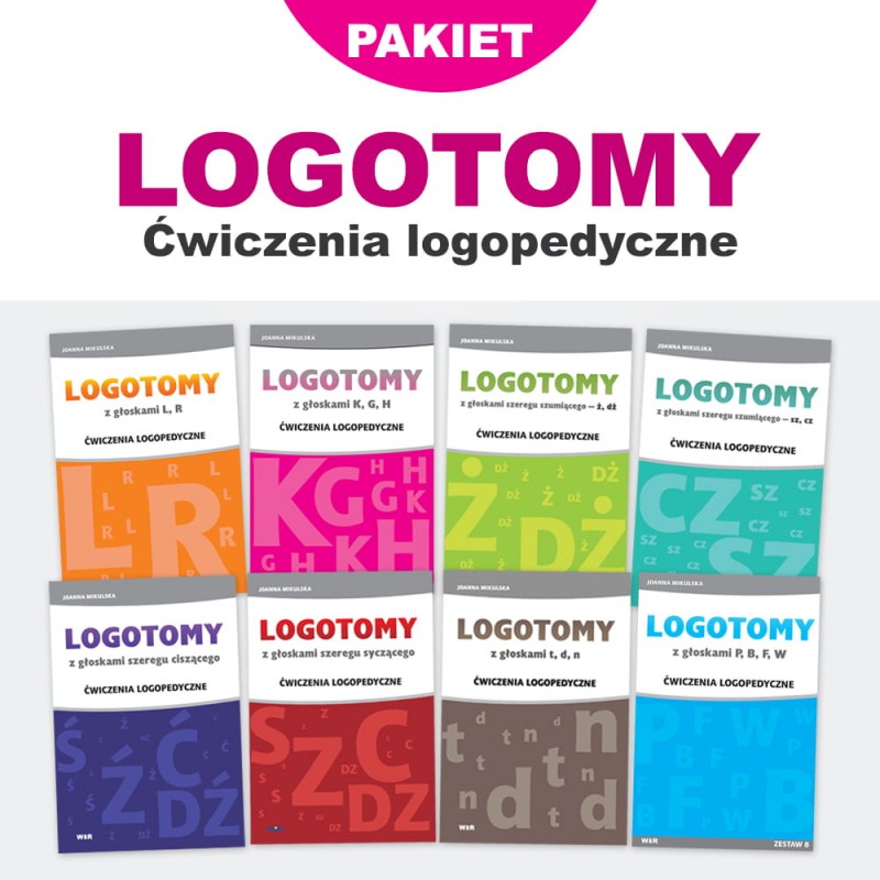 Absolutnym bestsellerem i pomocą bez której nie może obejść się żaden logopeda pracujący nad rozwojem mowy i zmagający się z kłopotami artykulacyjnymi u swoich pacjentów, jest seria ćwiczeń Logotomy - ćwiczenia artykulacyjne. Pakiet "Logotomy..." to osiem zestawów ćwiczeń wspomagających pracę dziecka nad poprawną wymową głosek. To doskonała pomoc dla terapeutów, logopedów, nauczycieli i rodziców, chcących urozmaicić monotonne ćwiczenia logopedyczne. Materiał zawarty w zeszytach będzie wykorzystywany podczas terapii sygmatyzmu, rotacyzmu, kappacyzmu, lambdacyzmu, a także w terapii głosek t, d, n, p, b, f, w, czyli w rezultacie dotyczy większości głosek zaburzanych przez dzieci. Materiał zachęca dziecko nie tylko do wielokrotnego powtarzania materiału słownikowego, ale także do ćwiczeń grafomotorycznych, posługiwania się nożyczkami, dopasowywania. Wiadomo, że rozwój motoryki małej pozytywnie wpływa na rozwój mowy, stąd też w tej pozycji wiele jest ćwiczeń wodzenia paluszkiem po śladzie, porównywania, kategoryzowania, wycinania czy liczenia. Ćwiczenia zostały ułożone zgodnie z zasadą stopniowania trudności, tak jak dziecko naturalnie uczy się i nabywa głoski języka polskiego. Niewątpliwym atutem Logotomów jest możliwość powielania kart pracy, dzięki czemu logopeda ma możliwość zadawania prac domowych lub korzystania z materiałów na zajęciach kilkakrotnie (np. do sprawdzenia postępów w terapii logopedycznej).