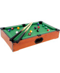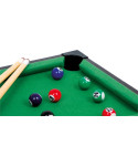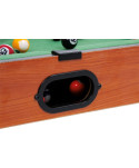 Materiał: drewno, materiałowe obszycie powierzchni stołu do gry, szklane bile, tworzywo sztuczne