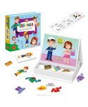 Puzzle magnetyczne – Ubranka. W zestawie znajdziemy 8 kart z wzorami, podpowiadającymi jaki obrazek odwzorować, twórcy mogą jednak dać upust swojej wyobraźni i tworzyć własne, kreatywne stylizacje.