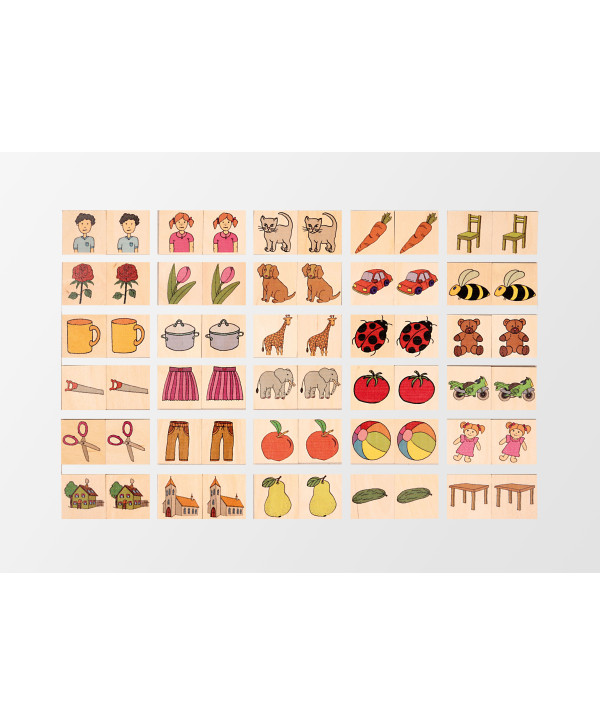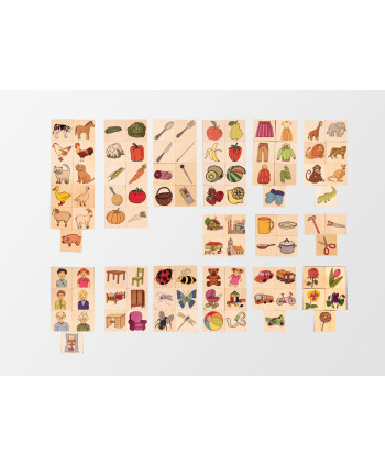 Skojarzanki to 139 drewnianych płytek z wizerunkami ludzi, zwierząt, roślin czy przedmiotów. Można wśród nich znaleźć chłopczyka, dziewczynkę, mamę, tatę, babcię, a także elementy garderoby, naczynia czy budynki. Podczas zabawy dziecko poznaje i porządkuje otaczającą go rzeczywistość i uczy się ją opisywać.